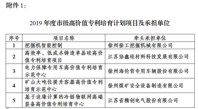 2019年11月27日,徐州市市场监督管理局知识产权发展促进处发布了针对2019年度的《市级高价值专利培育计划项目及承担单位》、《2019年度市级企业知识产权战略推进计划项目及承担单位》、《2019年度徐州市专利领航企业》以及《2019年度徐州市专利小巨人企业》的评选情况,确定含"江苏协鑫"在内等5家单位承担2019年度徐州市高价值专利培育计划项目,并予以公示。